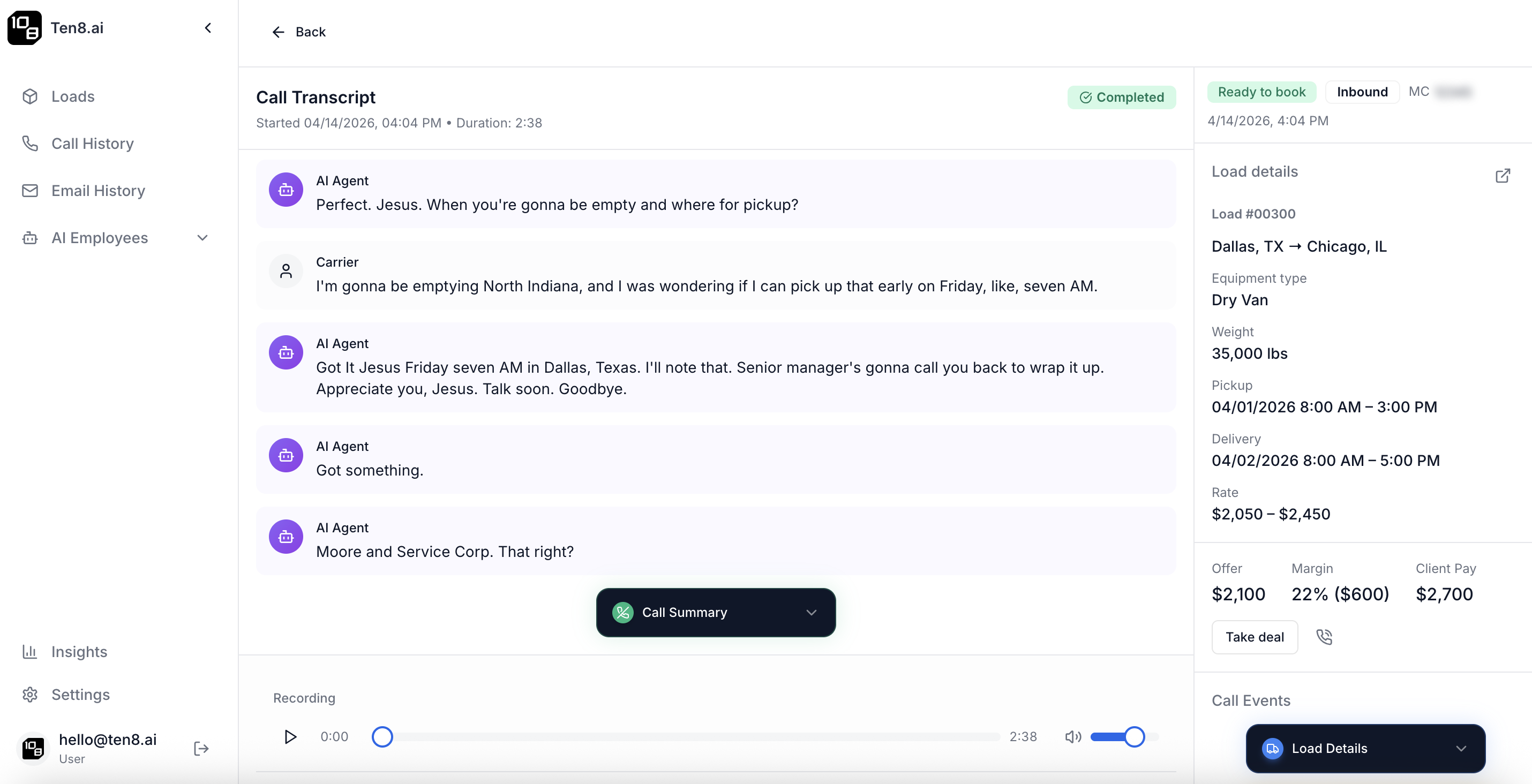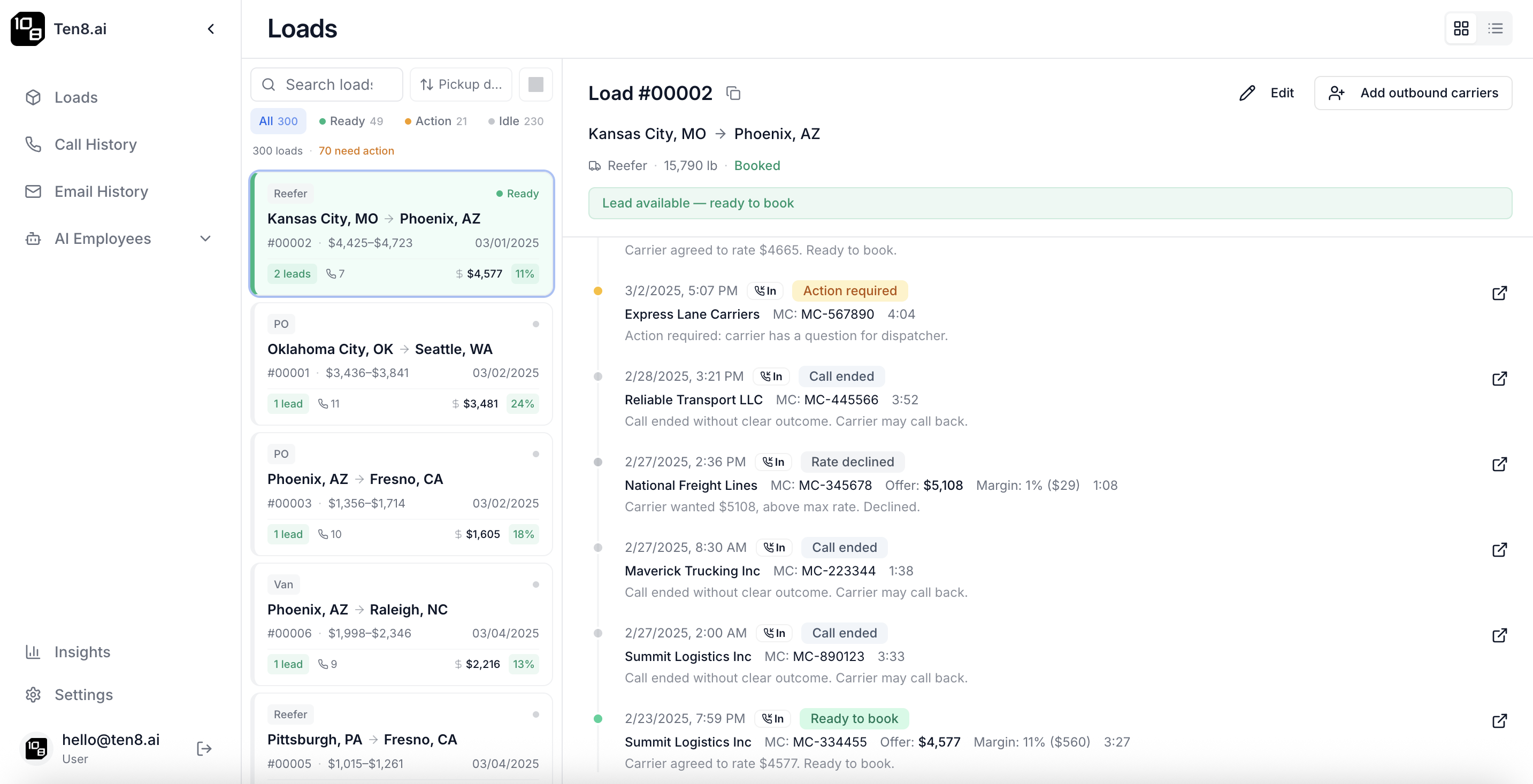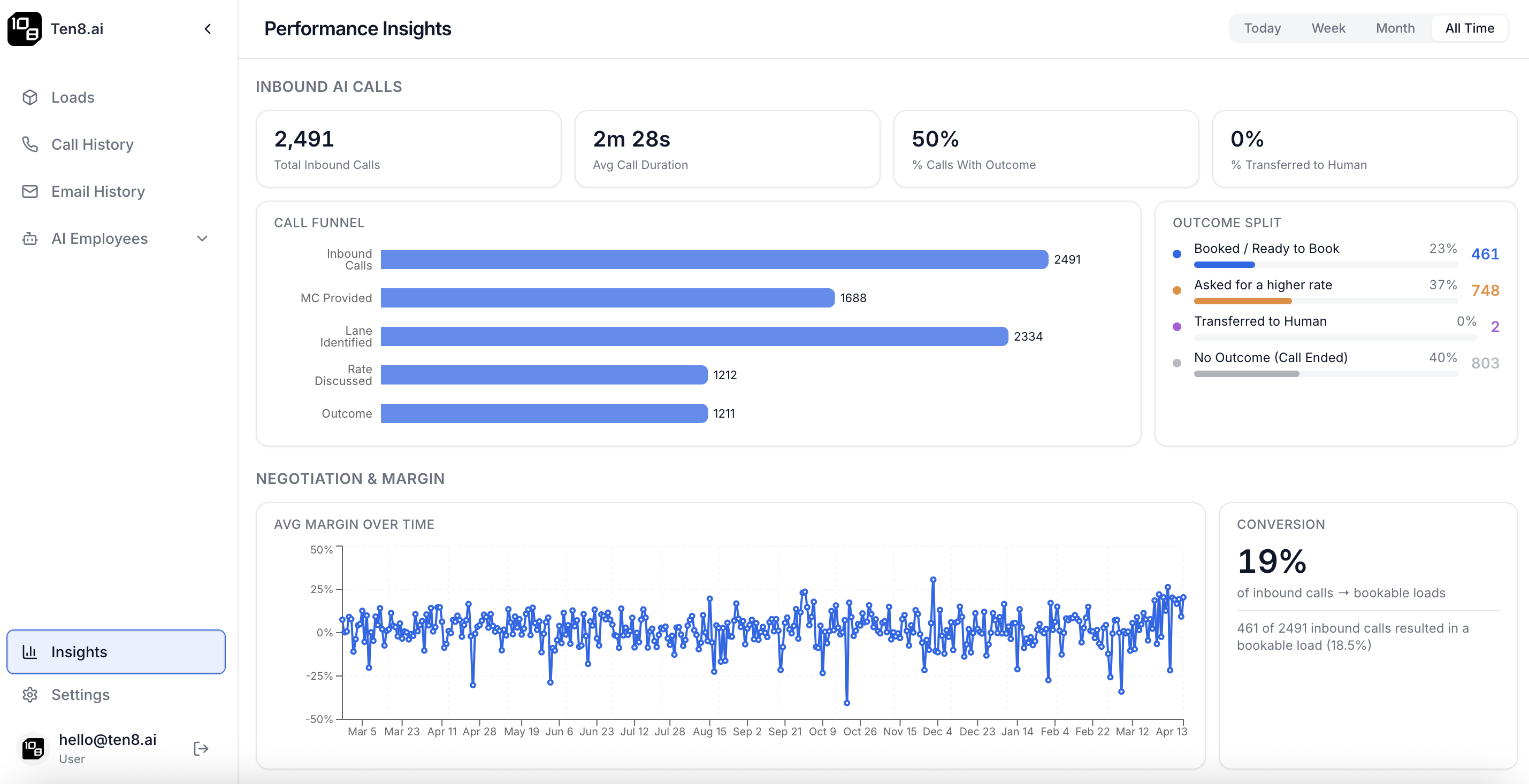 Ten8 voice AI answered 100% of inbound carrier calls, handled MC verification, communicated load details, and negotiated rates — all without human involvement for routine interactions.